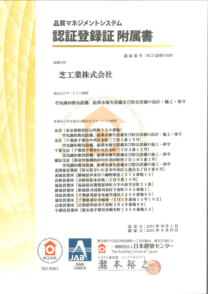 | 認証範囲 | 空気調和換気設備、給排水衛生設備及び防災設備の設計・施工・保守 |