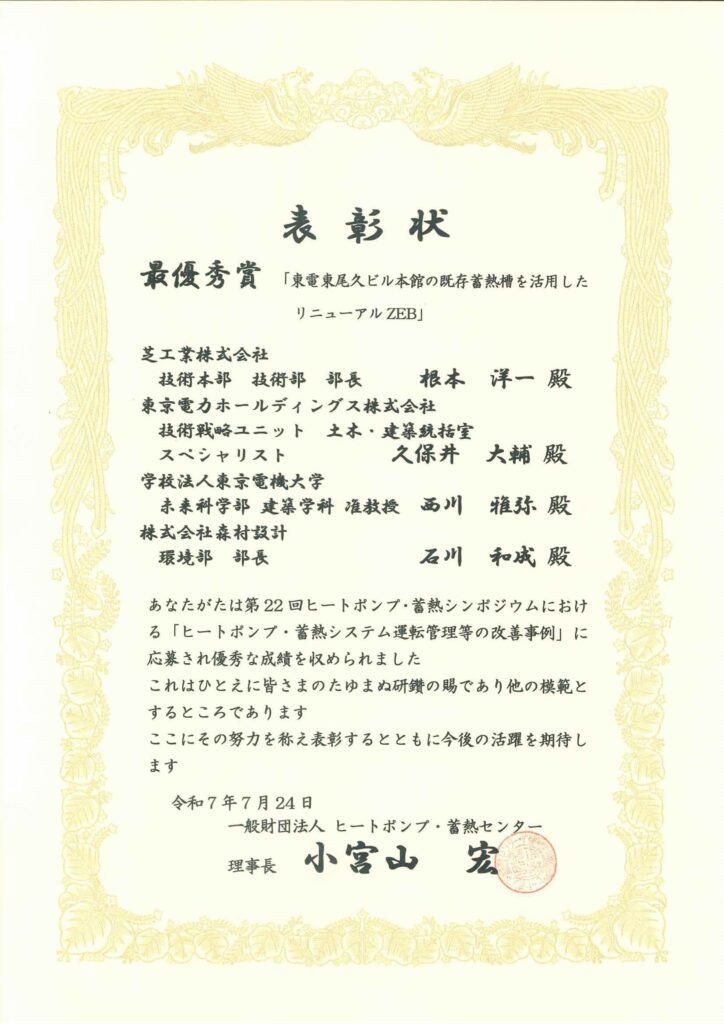 令和7年度「ヒートポンプ・蓄熱システム運転管理等の改善事例表彰」の「最優秀賞」を受賞しました